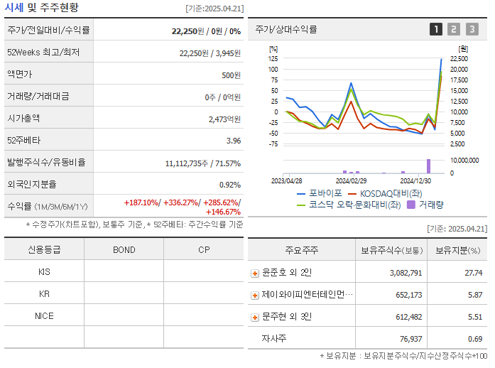 2023년 기준으로 포바이포의 매출은 전년 대비 소폭 상승했고, 영업이익 역시 흑자를 유지했습니다. 하지만 기술 기반의 콘텐츠 기업 특성상 실적보다 ‘향후 기술력에 대한 기대감’이 주가를 움직이는 요인입니다.